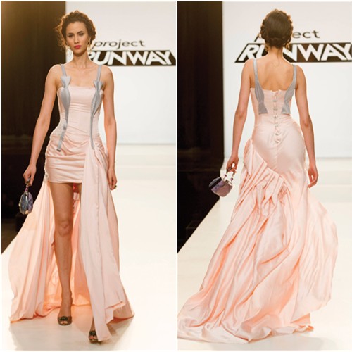 Sandro’s look was unfortunate. That soft shell pink is not a good look for any girl over the age of 18 months. The draping of the overskirt was heavy and uneven. I kind of liked the pseudo-garter look he did with the ties. I’m still glad he’s gone. I realize that Helen was having a moment but the way he was screaming at her raises a big ol’ red flag that says, “potential abuser” to me.