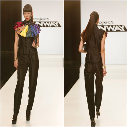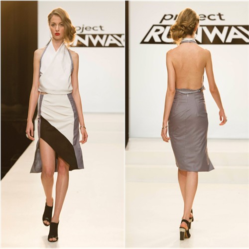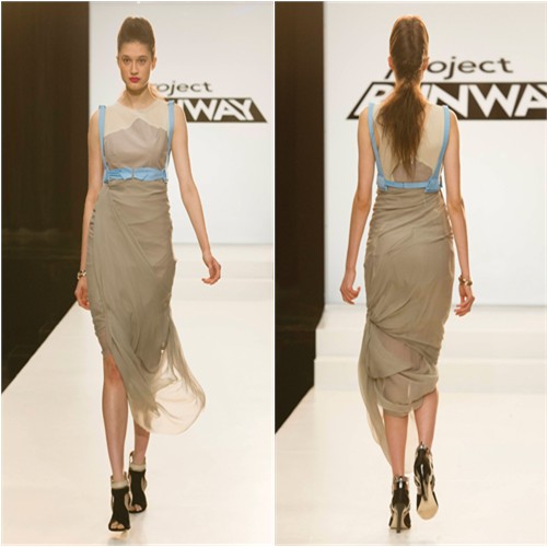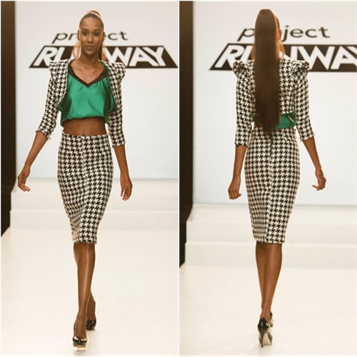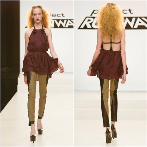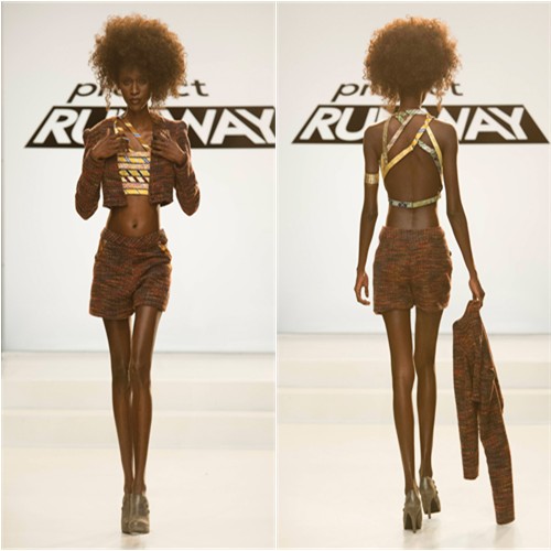 I thought this was a great look – the woven top was cool, and the tweed jacket/shorts combo was pretty excellent. It wasn’t my favorite look of the episode – maybe because the model looks terrifyingly frail enough for her bones to simply disintegrate on the runway – but Brandon continues to prove that he’s a major frontrunner this season.