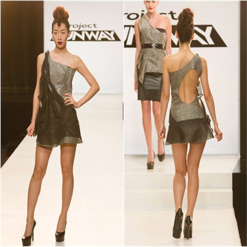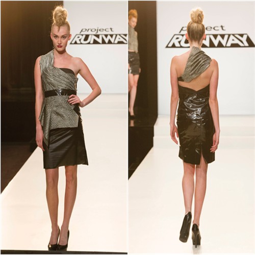 I love that Lifetime’s official photo of this look shows Kate’s model in a freaking robot pose, so you can tell even in pictures just how impossible it was for the model to walk down the runway in this outfit. This poor girl walked like she was being stabbed by a thousand tiny little knives. And I don’t know why a little black dress was deserving of so much of the judges’ positive attention, but then again, if it were up to me, their pet Kate wouldn’t even be on this season. She was rightfully eliminated last year, and no one except the producers is interested in her redemption story.