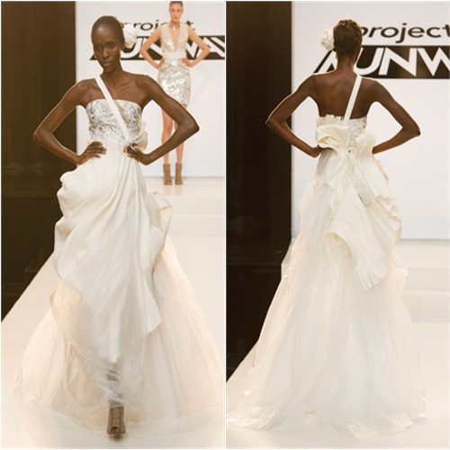 I could not stop laughing at how NOISY this skirt was – with every step the model took, the skirt crackled like it was about to explode into a roaring fire. It was incredibly distracting, but not so distracting that I could ignore the fact that this was terribly underdesigned. Alexandria had to work with a total bitch (Ken) and someone with basically no construction skills (Sue), so I appreciate her predicament, but she also played the nice girl until she knew she’d have to throw someone under the bus in order to stay in the competition, so I can’t have too much pity for her.