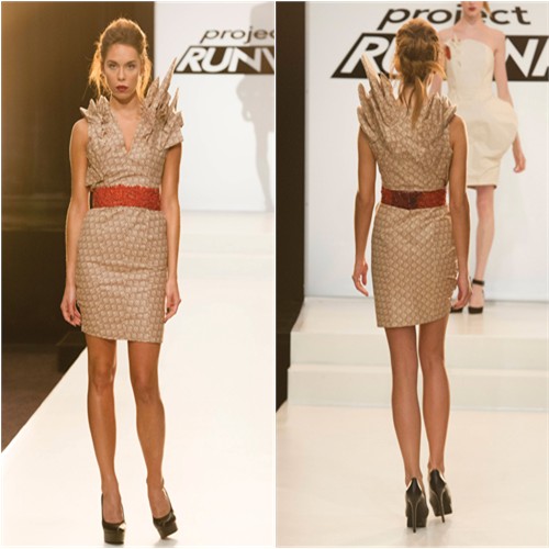 The back is kind of  a nightmare, and the general shapelessness of this look was a problem, but it was definitely a big improvement for Karen, who has made some really unfortunate garments in the past. This had intrigue and thought behind it, even if the construction leaves something to be desired. Also, I’m pretty sure those cap sleeves are made of coconuts. COCONUTS. This wouldn’t have been anywhere near the top three for me, but it at least proved to me that Karen’s got some tricks up her sleeve.