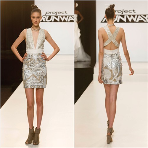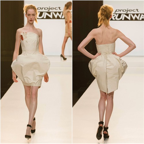 2. Jeremy’s dress was fairly sleek and I liked the ombre lines on the side, but I couldn’t help noticing that the peplum was positioned higher on the left side than on the right, and not enough to make it purposeful. Karen’s was fun and Kate’s was boring. Dom, Helen, Justin and Alexander’s looks were meh- not particularly attractive, but not toxic waste, either. Bradon’s gown drifted like a snow bank, astonishingly graceful. Miranda’s dress reminded me of Laura Bennet’s design esthetic, probably because I don’t know enough about designers but reference Mary Katrantzou, but it was what Michael Kors described as “a little skirt, a little spare bare neckline..”