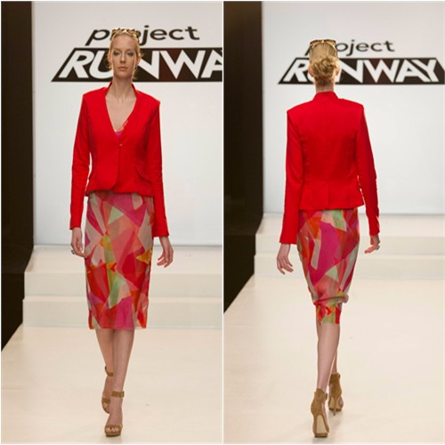 Since Jeremy is only capable of designing for old ladies, I wasn’t sad to see him go. I hated this jacket, which screamed “politician’s wife.” Jeremy has no concept of how to style a woman who hasn’t yet reached menopause. So I’m not denying his auf-ing was imminent – but the fact that Ken the Sociopath remains on this show despite never creating anything worthwhile makes me feel that this elimination was slightly unfair.