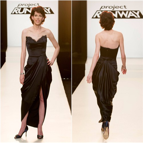 I couldn’t even believe what I was hearing when the judges over-praised this makeover. This client came in looking 20 years old, and left looking twice that age. The judges called the hair Mia Farrow, but I thought it looked much more like Kate Gosselin. We can blame the Loreal team for all of that, but Bradon is to blame for this really disappointing and equally overpraised dress. I thought this was awkwardly proportioned, boring, and not nearly as flattering as a good little black dress should be. This look slid into my top three by default, but the judges acted as if it had some measure of brilliance to it, and it most decidedly did not.