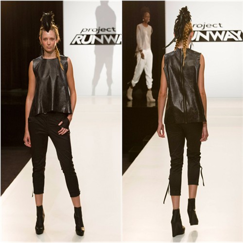It’s hard to see the beauty of this look in photos, since the detailing on the textured black garments is basically invisible here. But go watch the episode in HD and you’ll likely be as impressed as I was by the level of care, creativity, and construction that went into each of the thirty pieces Alexandria brought with her. That little half-glove pocket insert thing in the pants looked incredibly cool, and Alexandria seems to be full of unique, fashion-forward little ideas like that.