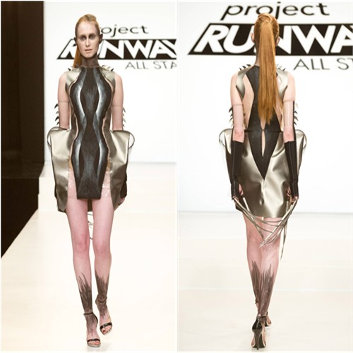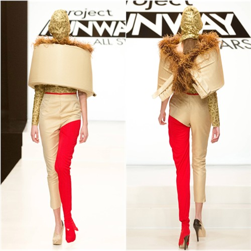 A very solid entry. It was worthy of the top three just because it looked so different from everyone else’s work, but it also looked quintessentially Elena. I love the colorblocking and the way she recreated the insect shell, but I can’t pretend that a silhouette this simple is avant garde, even if it comes in crazy colors. This wouldn’t have looked too out of place in her decoy collection, which is what makes me think it’s not quite over the top enough to really be avant garde.
