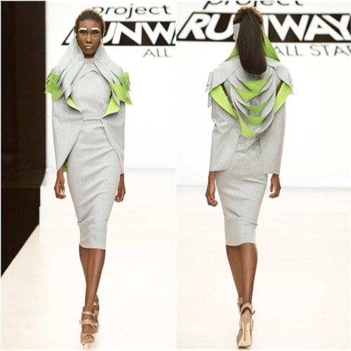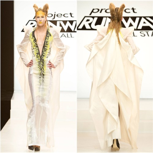 First of all, a thousand points to Viktor because he was literally fanning himself during the runway show. WITH A FAN. I think I had to pause the show to laugh for ten minutes after that. But I am surprised that this didn’t make it to the top three, since I thought it was by far the most incredible garment on this runway. I thought the silhouette was thought-provoking and interesting, but still flattering; the design following the neckline is absolutely gorgeous; and the styling absolutely kicked ass. My undisputed pick for the win, no matter what those crack-smoking judges might think.