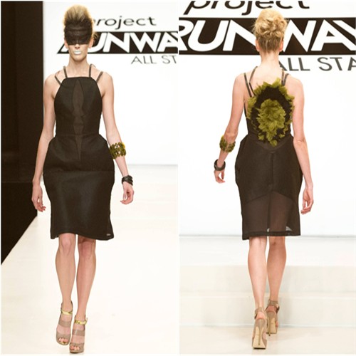 I thought this was fairly stunning and a very impressive entry from Christopher, who I tend to consider one of those designers that’s here for the soundbites and not because of his design skills. But this actually made me stop and think and want to see it from every angle, which is about as much avant garde as a person can hope to accomplish in a single day. (Especially if that person is Christopher.) I loved the smoky effects more when I thought they were fabric, but since I just saw a photo of Christopher backstage spraypainting his model’s neck, I’m thinking the designs at the ankles might be paint as well. Not necessarily a bad thing, but I was blown away when I thought he had created that smoky look with fabric rather than spray paint, and now I’m somewhat less so. I think my least favorite element of this design were the clear plastic panels in the skirt, which absolutely looked like Christopher ran out of fabric and grabbed a roll of saran wrap to try and remedy the situation. But I found his bug inspiration to be clear without being literal, and I thought the details on the arms and shoulders were a lot of fun.