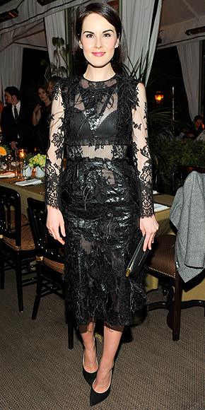 I love the expression on her face. “I’m Lady Mary, and you can see my bra! Isn’t it just bizarrely fabulous?!” Yes, Lady Mary, it is. I love all the lace and texture happening on this dress, and I’m glad she kept the styling sleek and minimal to let the dress’s embellishments do all the heavy lifting.