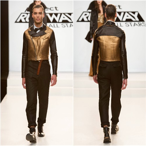 Oof. I love Mychael, but this was a mess, and his elimination was fair. I could not stop seeing this as a Chippendale’s costume – I was convinced these were tearaway clothes that the model was mere moments away from, well, tearing away. There was no way to make that gold fabric work, especially when the jacket ended up so tight on the model.