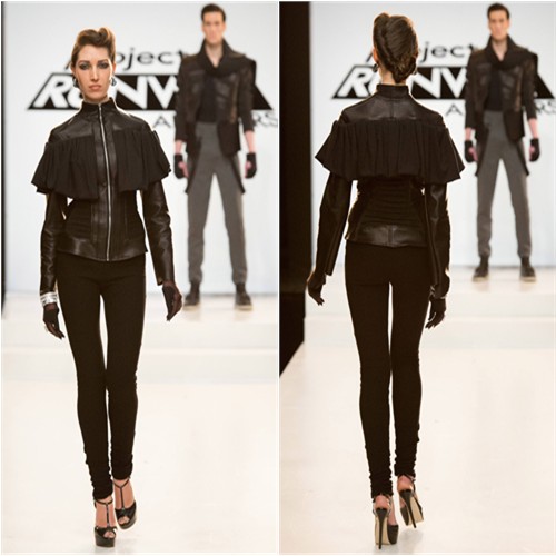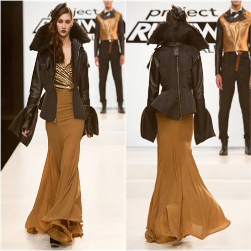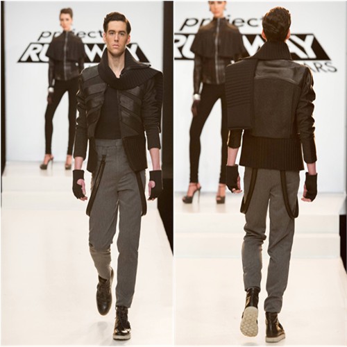 By far my favorite look on the runway. I thought this was brilliant, perfectly executed, fabulously styled, incredibly wearable yet high fashion, and true to the inspiration. I don’t know why the judges hated on the leather embellishments – maybe he could have nixed the ones at the elbows, but other than that, I think they’re stunning elements and necessary to the gritty-meets-pretty aesthetic Seth Aaron was going for.