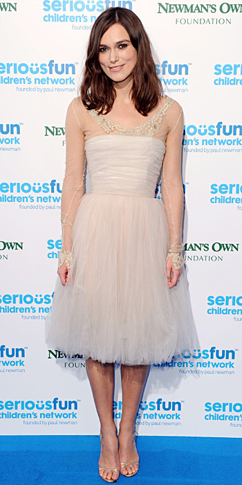 Keira Knightley wore this dress to her wedding, but without the sleeves. I believe that, since the otherwise-perfect dress has the saddest, most tacked-on-looking sleeves I’ve ever seen. I respect her for trying to re-wear her wedding dress, which she apparently recycles pretty often, but it was just so much nicer-looking before the sleeves.