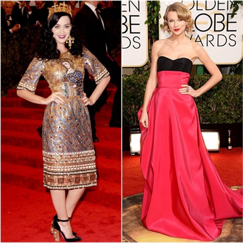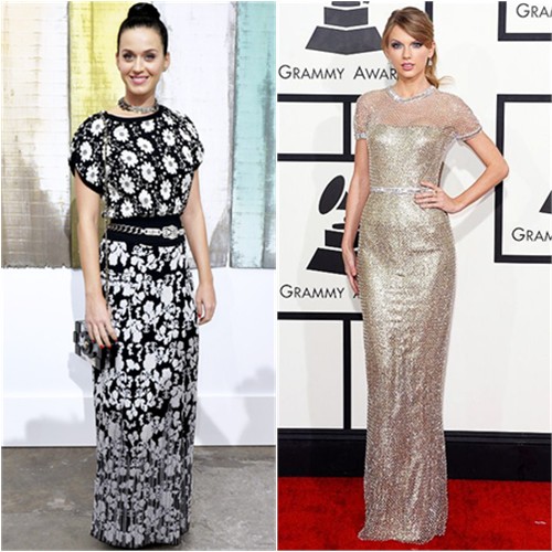 Katy’s dress by Bottega Veneta, purse by Céline, shoes by Bionda Castana; Taylor’s dress by Oscar de la Renta, shoes by Christian Louboutin