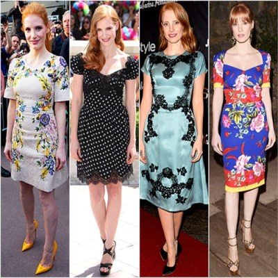 Why Jessica Chastain? Because she’s addicted to Dolce & Gabbana’s short-sleeved printed dresses.