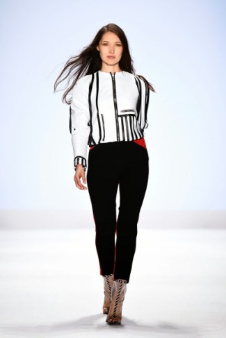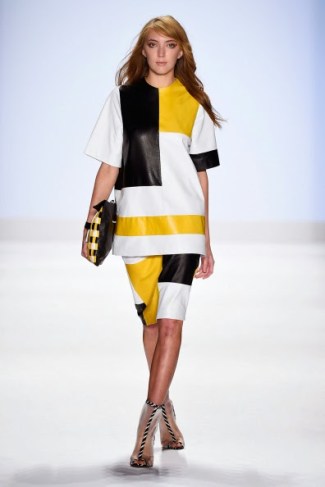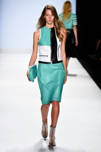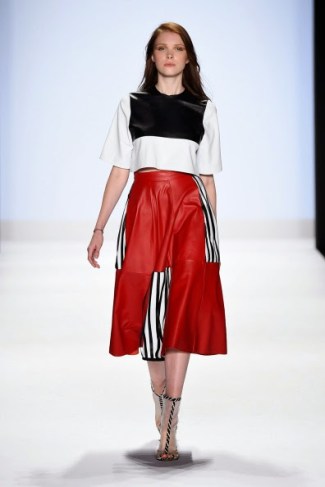 She made terrific use of leather and color in her collection. It kept each look connected to the one that came before it, without making me feel like I was watching ten of the same dress walk down the runway. And I think those clear booties with the black-and-white striped embellishments were strangely brilliant.