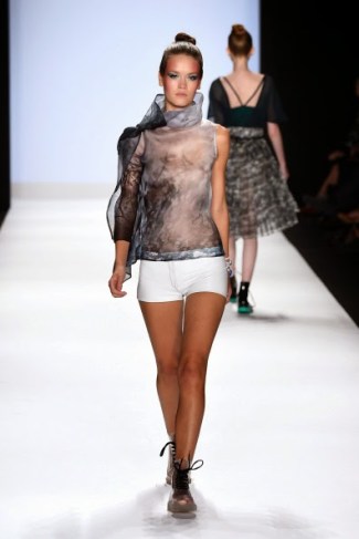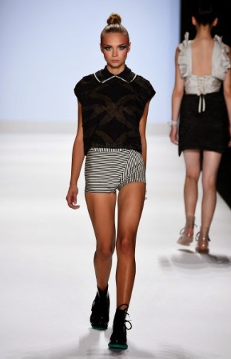 You can see the back of the previous look in the background, which makes me angry, because I liked that top until I saw it from this angle. It had more than enough going on in the front – it didn’t need to be a corset in the back as well. Anyway, this is one of the weaker looks of the collection. An ill-fitting collared tee and some shorts that are basically underwear? I’m underwhelmed.