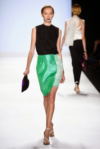 I don’t think the asymmetry alone is enough to make this skirt a success. The darker green fabric just looks puffy and uncomfortable, and I don’t like the way it looks on the model’s figure.