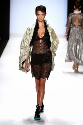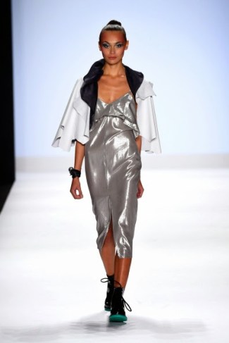Sandhya: Would have been a strong contender for the win if she had still be in the run. The second look doesn’t fit into her collection at all though. Unlike you I liked the effect on the writing, but I didn’t like the actual messages. Honestly, who wants to have “bomb” writing over her breast and “explosion” over her crouch? Or inviting messages on a dress which looks like it peels of the body easily? I also think that she repeated the some silhouette and the same décolleté way too often, which is the main reason I am gravitating more to Fäde’s collection.