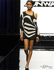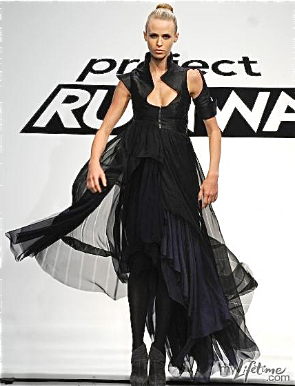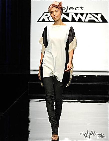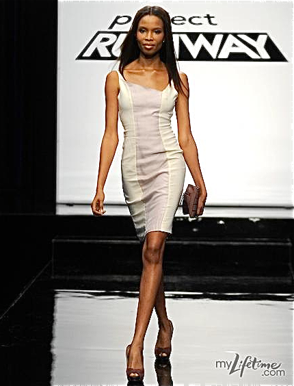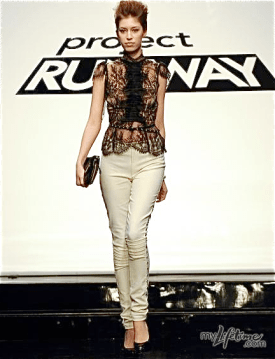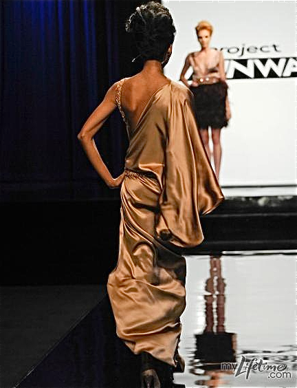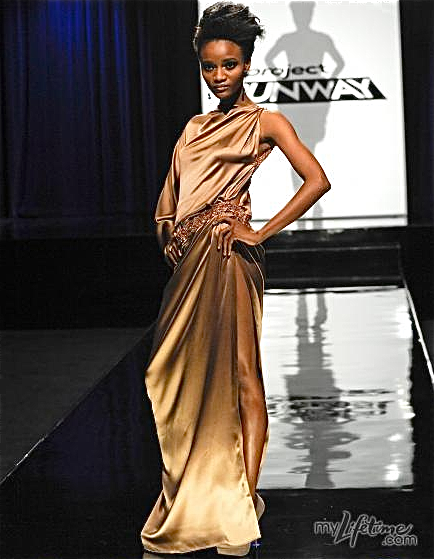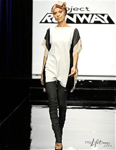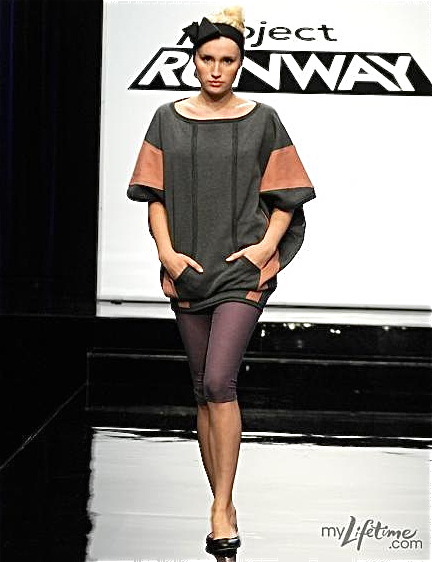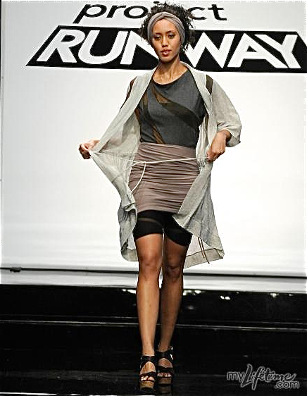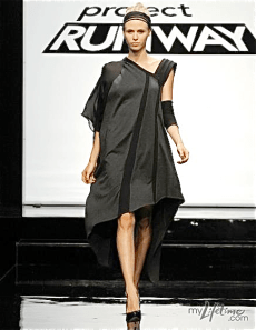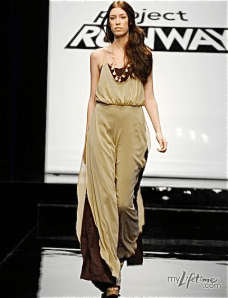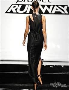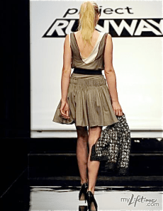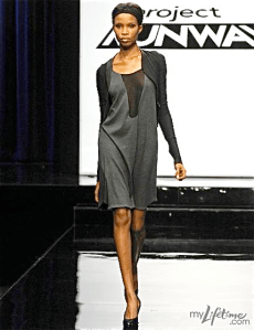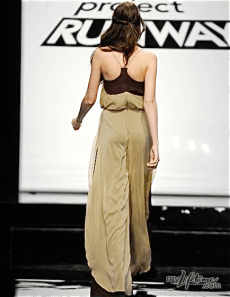 I’ve seen designers get eliminated in week one for pulling out trash like this. How is it possible that Ivy has not been eliminated yet? Seriously, look through her work on this show, and you’ll realize that a) she’s terrified of color, b) her construction skills are weak at best and c) NOTHING she makes is fashionable. NOTHING. Everything is shapeless or styleless or colorless or all three, like this sad, sad garment. I know Michael D can’t sew, but that’s not the biggest problem here – Ivy didn’t design anything. She may as well have pulled out a few yards of fabric, wrapped it around her model, stapled it together, and sent her out on the runway. This is unacceptable.