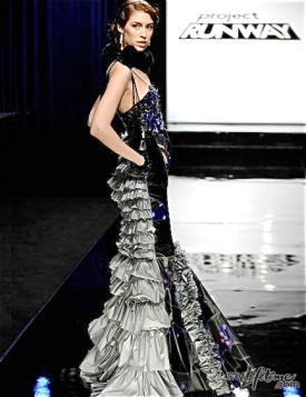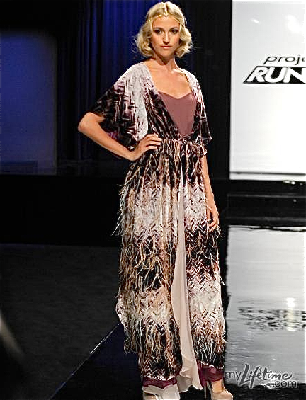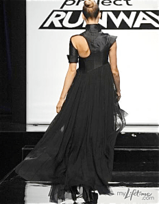 Since this season began, I’ve never liked anything Gretchen designs as much as the judges praise it. Sometimes it’s just a matter of personal taste – the 1970s aesthetic that’s all over Gretchen’s mind and the New York Fashion Week runways right now is really not my style – but sometimes, I just want to tell Michael, Nina, and Heidi to put down the crack pipe and open their eyes. This is ugly, dowdy, matronly, and not even remotely couture or high-fashion. I don’t think it feels expensive or chic, and the back, which the judges creamed their pants over, looks beyond tacky to me. I’ll concede that the feather work is nicely done, but this is not a garment that a real woman wants to wear.