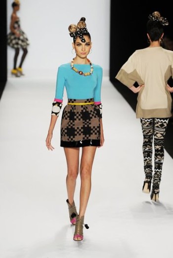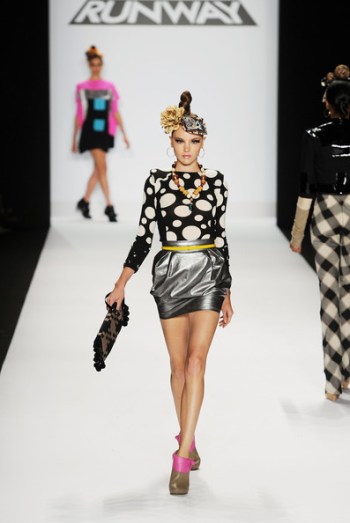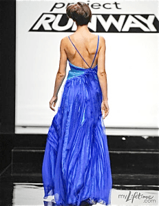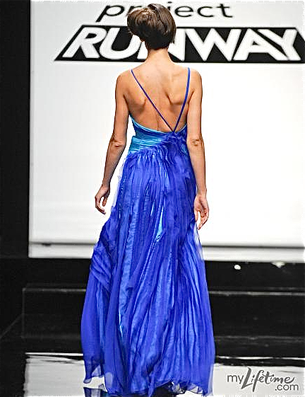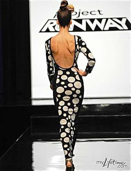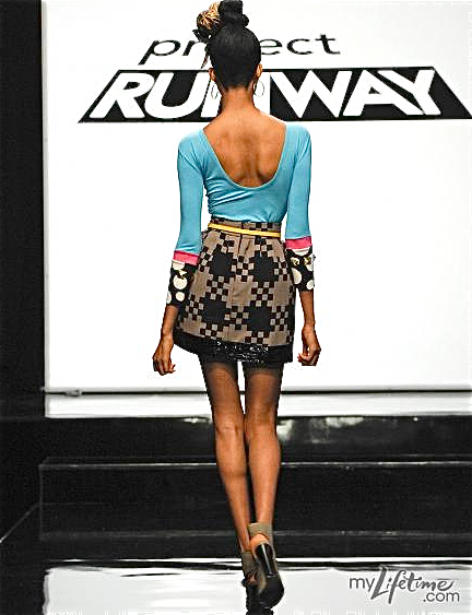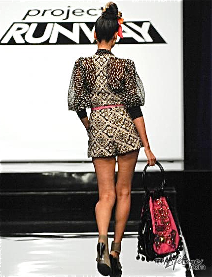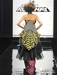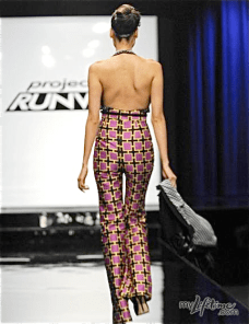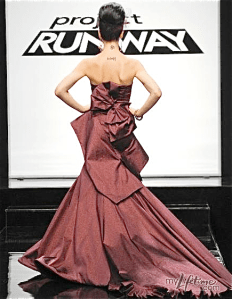 I didn’t love the front, but this was by far the best look on the runway. I hate that the bodice sits so far away from her chest, and the black satiny fabric he used for the front looks cheap and tacky, but the back is simply stunning. I agree with the judges that the length is a problem (too short in front, too long in back), but the back of this dress is the only thing on the runway that I would call high fashion. As always, Mondo mixes prints and colors with impeccable skill, but what amazes me is the geometric, architectural shapes to this skirt. It’s not simply draped in back – it’s practically origami folded in such a complex and beautiful way.