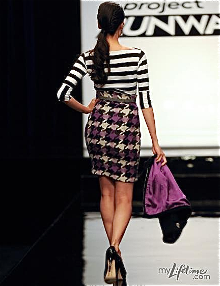 Do I even have to say anything, dear readers? THIS. IS. AMAZING. This is by far my favorite look of the season, and I’m pretty sure it’s in my top 5 best Project Runway designs of all time. The shock of purple as the lining of the coat was simply brilliant – it’s Mondo’s keen eye for detail that takes this look from great to incredible. That top is classic American sportswear in the best sense of the term. It fits so incredibly well, and it was a stroke of genius to take the cuffs of the sleeves and do them in vertical stripes instead of horizontal. And my faithful readers know by now that I’m obsessed with sleeves that hit right at the elbow – Mondo’s picking up on a great trend.
