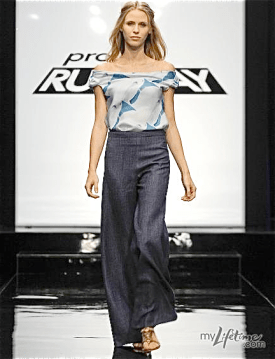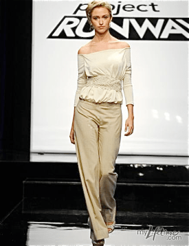 Ugly pants and a matronly top. Isn’t this what Casanova designed in every episode? It was not nearly as bad as Ivy’s design, but I understand why the judges eliminated dear Casanova for this – it’s like he hasn’t listened to a word the judges have said to him throughout this competition. But I didn’t think the biggest problem was how matronly it was – I thought the problem was that this is the furthest thing from resort wear that I could imagine. Nothing about those ugly office pants is resort, and that shirt could not look less relaxed – it’s physically restraining her arms from moving. Resort wear is about relaxing vacation wear, whether it’s swimsuits or evening wear, but whatever Casanova designed here, it was not resort.