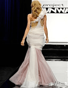 I feel like I should be sick of April’s goth-chic aesthetic by now, but I’m not. It doesn’t make for great television, because it’s hard to see the details in all her black outfits, but when you review them in photos, each garment is intricate and unique. I’m digging the leather-and-lace train in particular. It’s like Lady Gaga meets Twilight, which sounds like it should be terrible but actually sort of works! It’s not exactly couture, but it’s intriguing and creative, and for that, I’d have put April in the top 3.