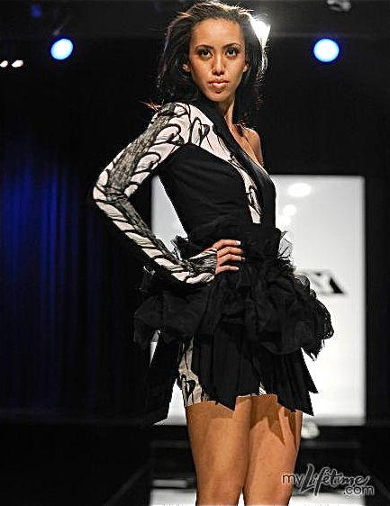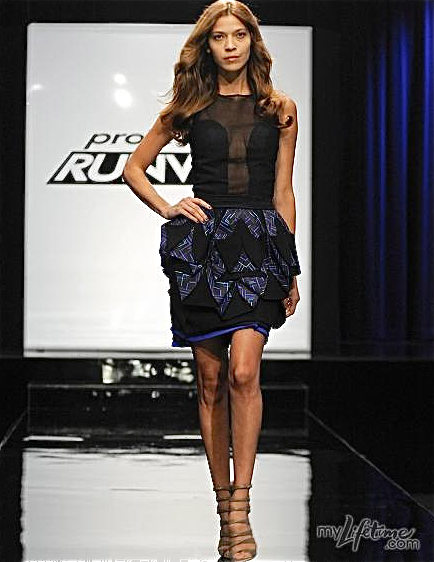 Another dark, sexy and intriguing look from April, who I love more and more every week. I like that she’s rough around the edges, with her gloom-and-doom aesthetic and general badass attitude, but she is clearly a gentle soul with a good heart underneath it all. This print, based on her parents’ divorce when she was 13, was stunning. The tree going up the model’s arm is beautiful and very unique, and her incorporation of the print into the design was rather brilliant. I love the silhouette and the styling, and I respect April for being the only designer besides Mondo to create real fashion for this challenge. She was my choice for the runner-up.