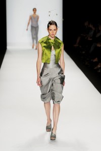 Trashy. The boobs don’t fit, the belt is fugly, the print is tacky and WHAT IS WITH ALL THE GIANT PANTS. Who is telling all the designers this season to just construct giant fugly pants and zippers? I’ve had enough. Even though this would probably be worn by a Jersey Shore cast member in Miami, at least it’s identifiably resort wear. So it gets a pass.