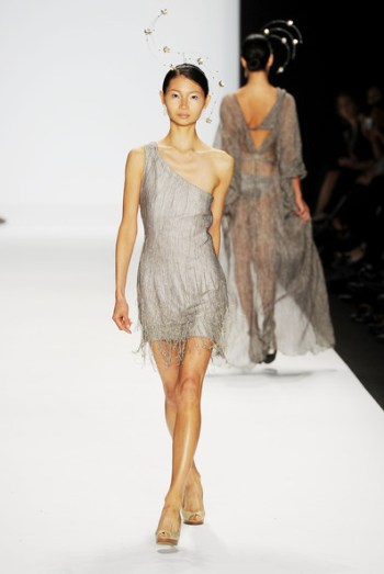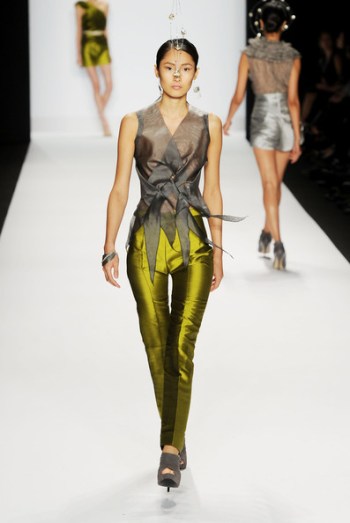 Cool pieces individually, but the colors are practically unwearable, even though they’re very eye-catching on the runway. I don’t like the wiry headpieces – they look like cheap Philip Treacy knockoffs, and I think they are primarily responsible for the loss of Andy’s real vision throughout this collection. They substitute his usual Asian Warrior Bitch for some sort of Alien Fairy Queen; it’s not nearly as interesting, and it doesn’t feel like Andy. Furthermore, the judges were right to point out that you need to open with something much bigger and bolder than this.