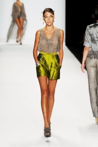 The top half of this is fierce, fabulous, and totally deserving of the win it received. I’m all about those funky straps, and I even like the zipper in back, though I will throw up if I see one more zipper on this runway. And though some bloggers and critics think the sheer material is too lingerie for resort wear, I think it’s just sexy and fabulous.