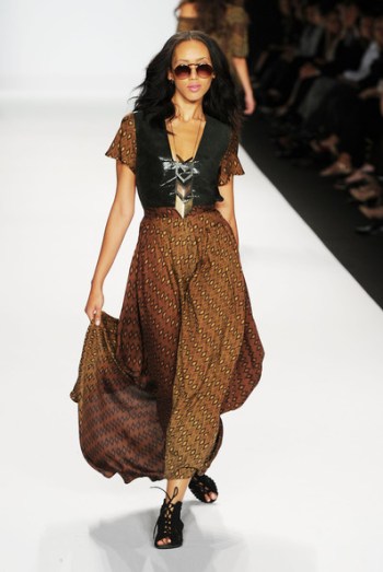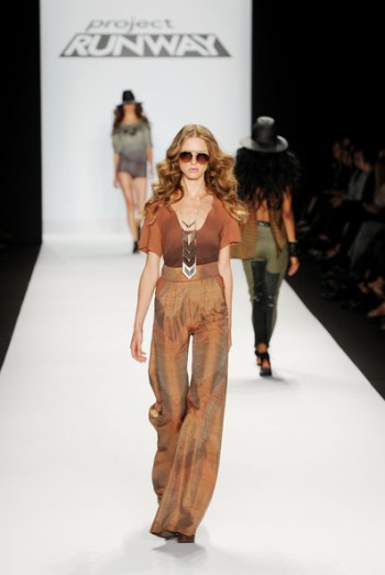 The jacket is actually quite cute (although the colors are awful), but I cannot believe that Gretchen opened her show with a giant brown diaper. And the judges praised her for styling her the way they recommended, but I’m still seeing Southwestern Granola all over this. The giant platform wedges and center-parted wavy hair are not high fashion. And I think the necklaces look very elementary. Any first-year design student could have designed that jewelry.