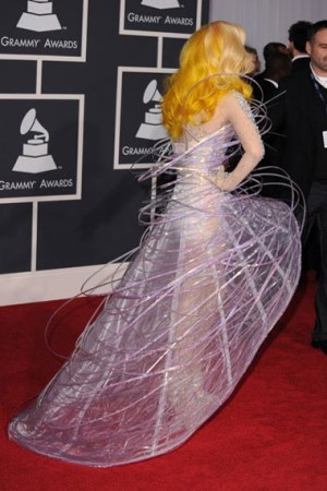 Lady Gaga once said that she dyed her hair blonde because she was concerned that if she stayed brunette, people would confuse her with Amy Winehouse. That was the first thing I thought when she stepped onto the red carpet last night – something about the big hair and retro makeup felt fabulously Amy (pre-substance abuse). Anyway, this outfit is terrifically tame as far as Gaga ensembles go. I actually love it, because it bears a semblance of a gown and a sculpture, instead of just pure insanity. It reminds us that fashion is art and art is fashion in a beautiful and modern way. I even sort of dig the bright yellow hair extensions, and I definitely love the little diamonds all over her body, a la Britney in Toxic.